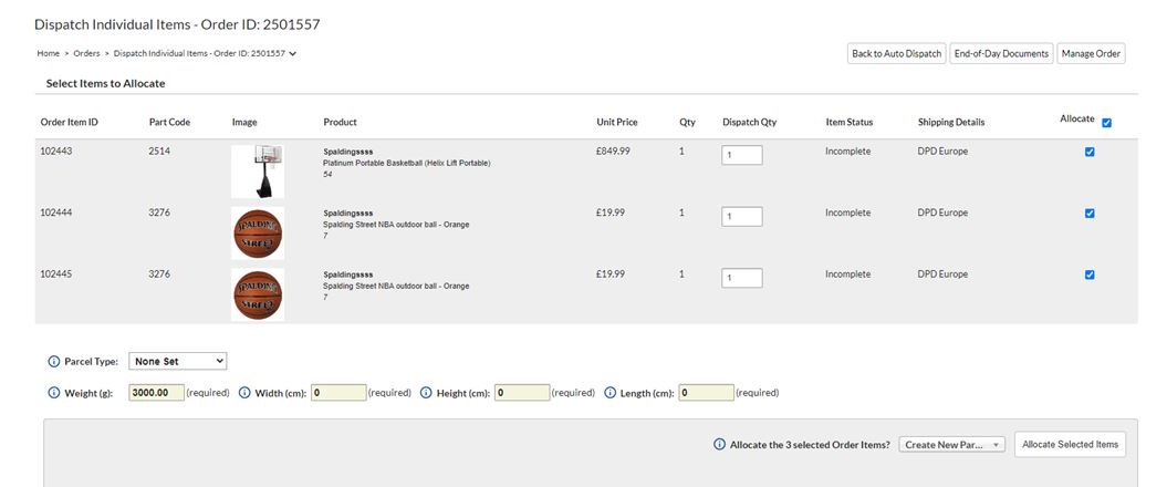 * Entering a value > 1 will open a new page for allocating individual items to specific Parcels within a Consignment. Details of how to Dispatch an entire Order across more than 1 Parcel are covered in HOW TO - DISPATCH ORDER ACROSS MULTIPLE PARCELS