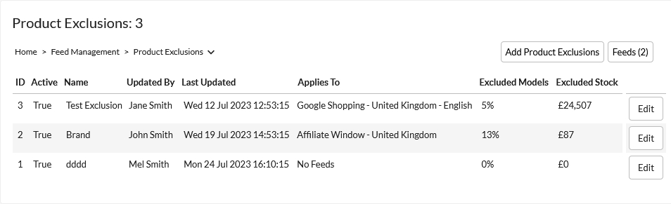When exclusions have been added, they will all display here in the grid